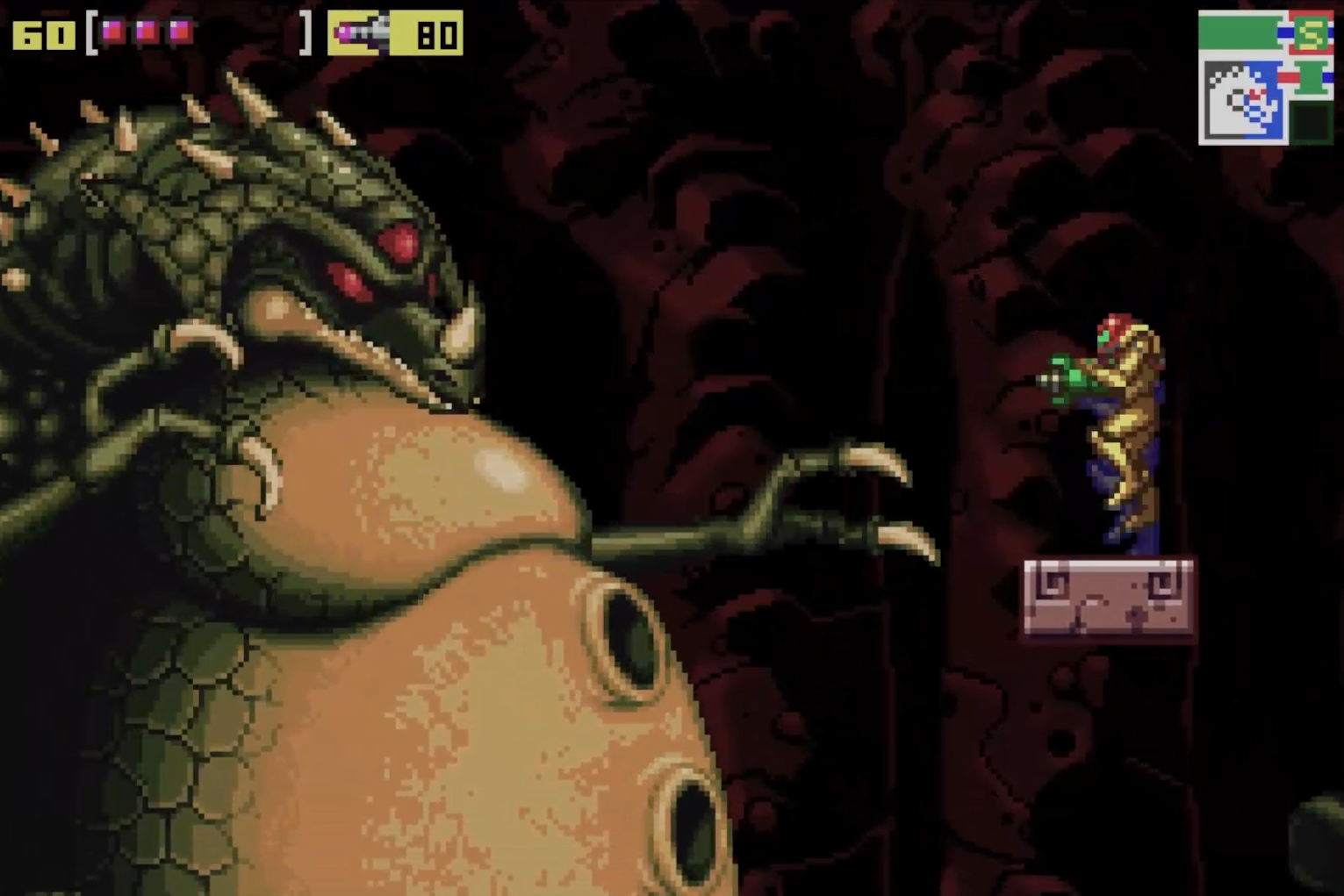 Kraid is one of those bosses that keeps coming back, though he doesn't have quite the lore reason that Ridley does. I think it's more that he's gotten carted around to every lab that could hold him simply because he's interesting. However, though he's normally difficult to hit, I think this is the game where he's the most difficult to hit. You have to spend a missile just to get him to open his mouth, and then the hand is so aggressively blocking that you really only have time for one hit. At least in Dread you get a larger window to attack. The only reason I would possibly call him harder in Dread is that he's got a much more varied attack pattern, so you can't just hang from a ledge and farm health and missiles until you're all healed up again.