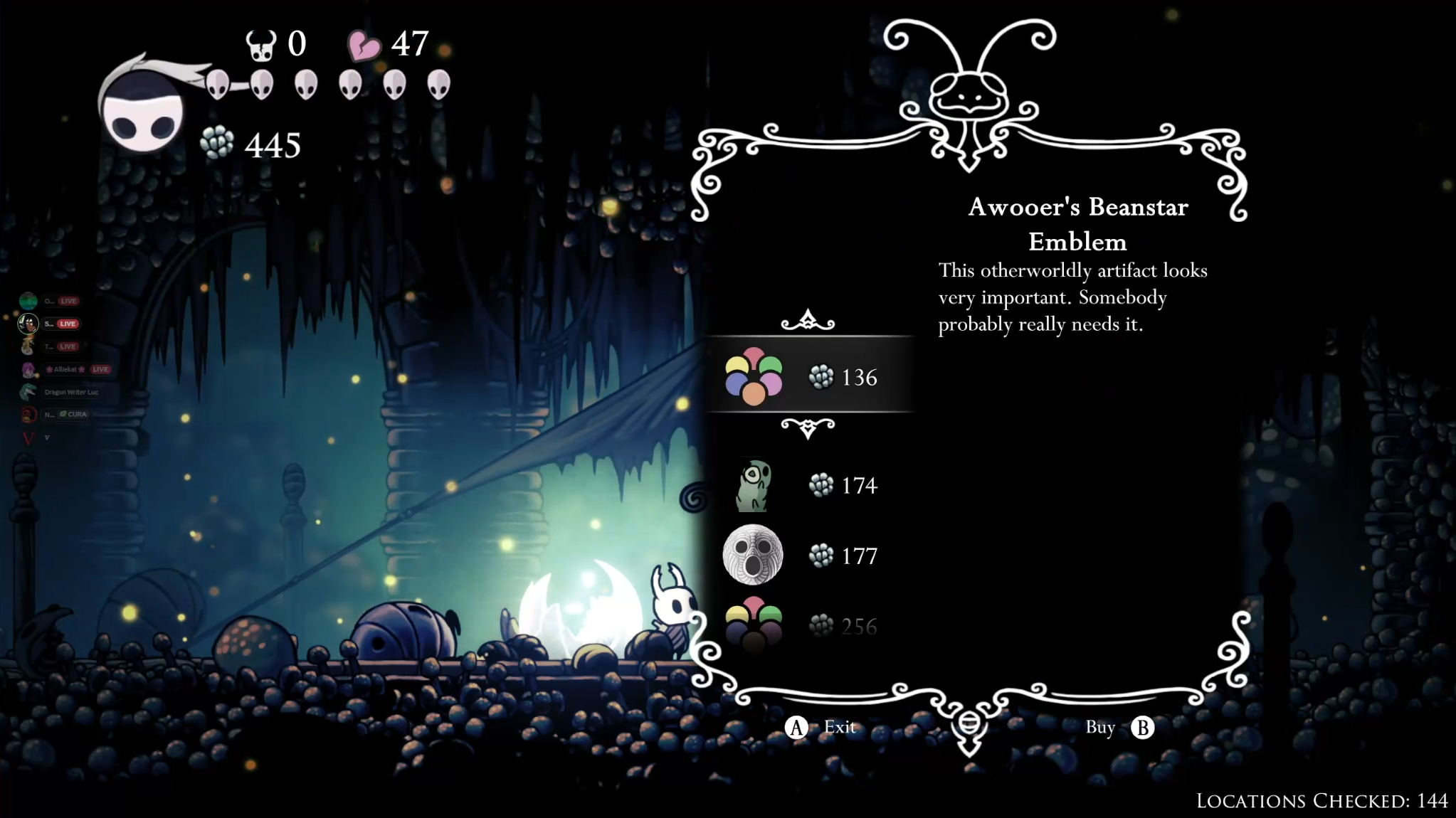 I was told to have something ready in case I was in BK Mode for an extended period. (BK Mode is how Negatron was for most of the time. It's basically where you have literally nothing that you can do in your game: all available checks have been made and you can do nothing but wait for your buddies to find something for you. It's called that because someone doing an Ocarina of Time Multiworld once said he was in "BK Mode, because I may as well just go to Burger King right now.") However, I didn't really. My backup was that I would probably swap to playing Picross on my Switch or something like that, but I know that Hollow Knight has quite a lot you can do with very little. Case in point, I was actively doing things the entire time, and I was the second to last to finish. (Last was Negatron, of course.)