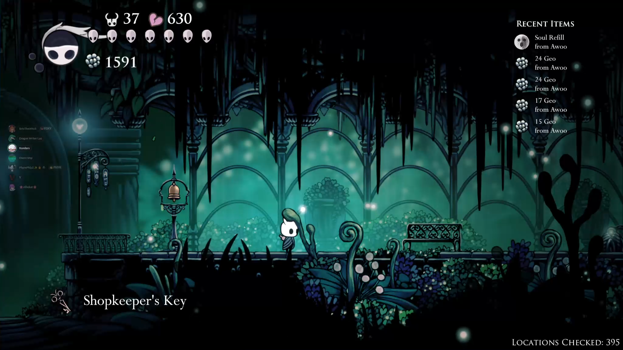 The special thing for this round was "deathlink", which means that if you die, so does everyone else. As if that wasn't hard enough, the game also added a bunch of death traps that just kill everyone when you pick up the random item. For some reason, these tended to go off right before I sat on a bench, so I had maximum backtracking, of course. This is also why I had two deaths before even starting. As I wrote in the chat, someone accidentally included a game they had no intention of playing, so the leader "released" every item in the game, which was a few nice items and two death traps. In Hollow Knight, deathlink only makes a shade if you don't already have one, so at least I don't have to worry so much about losing all my cash. I'm decent enough at this game that that's not really a problem. The hardest stuff is all in dreams (including White Palace!) and dying in a dream has very little consequence in Hollow Knight.