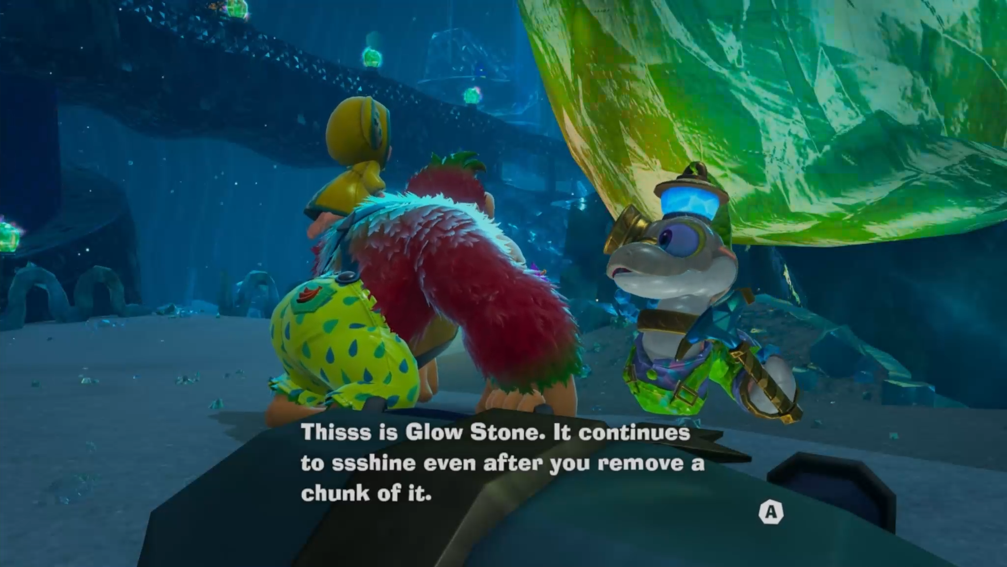 As we already had eels, I didn't expect any snakes beyond probably fossils (like we have of many of DK's animal buddies). However, much as our ostritch buddy Espresso's gliding has been replicated with a Bananza, we also get Rattley's jumping. (While I don't doubt that ostriches can probably glide a little, snakes simply cannot jump very high. They can launch themselves, but not even close to anything like the multi-screen height that Rattley gets, or the probably ten or so meters of the snake Bananza. I'm sure Pauline will comment on it eventually.) And the outfits on all the snakes are so cute! It's funny that the best-dressed characters are the ones without anything resembling hands. I'm a little surprised that the Underground's inventors haven't made any manipulators.